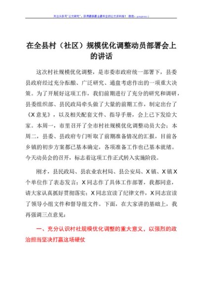 / 在全县村社区规模优化调整动员部署会上的讲话