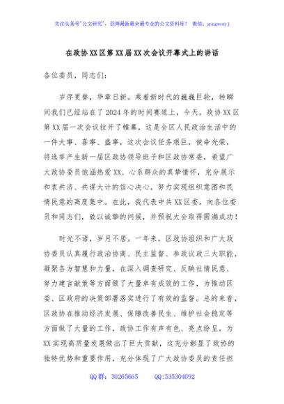 / 在政协XX区第XX届XX次会议开幕式上的讲话