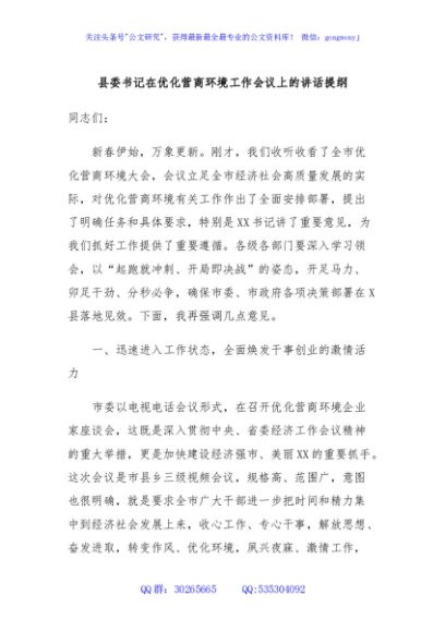 / 县委书记在优化营商环境工作会议上的讲话提纲