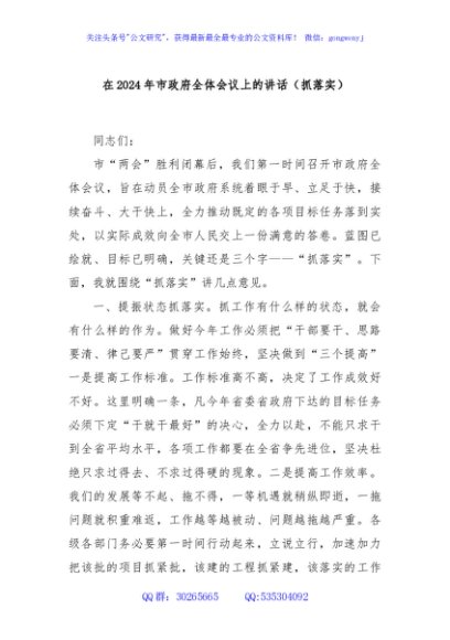/ 在2024年市政府全体会议上的讲话(抓落实)