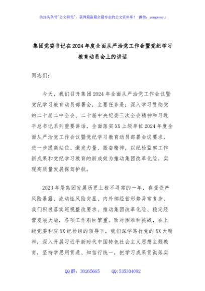 / 集团党委书记在2024年度全面从严治党工作会暨党纪学习教育动员会上的讲话
