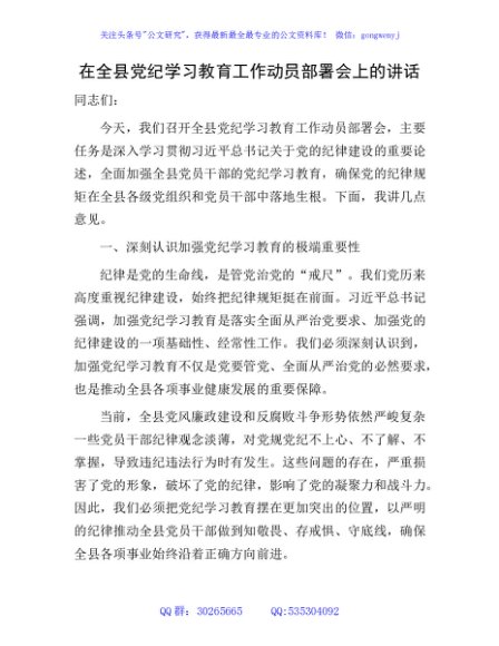 / 在全县党纪学习教育工作动员部署会上的讲话2200字