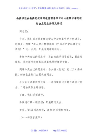 / 县委书记在县委党纪学习教育理论学习中心组集中学习研讨会上的主持词及讲话