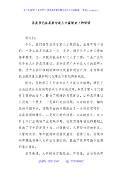 / 县委书记在县委专家人才座谈会上的讲话