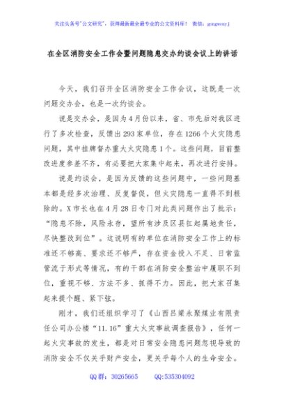 / 在全区消防安全工作会暨问题隐患交办约谈会议上的讲话