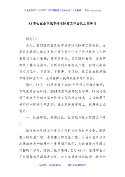 / XX市长在全市城市排水防涝工作会议上的讲话