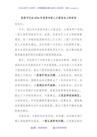 / 县委书记在2024年县委专家人才座谈会上的讲话