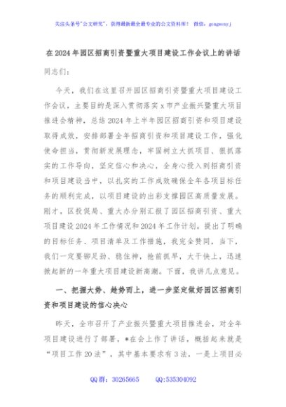 / 在2024年园区招商引资暨重大项目建设工作会议上的讲话