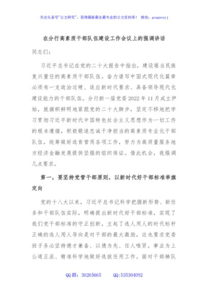 / 在分行高素质干部队伍建设工作会议上的强调讲话