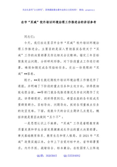 / 在市“双减”校外培训环境治理工作推进会的讲话参考