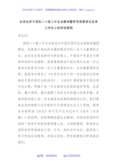 / 在传达学习党的二十届三中全会精神暨研究部署深化改革工作会上的讲话提纲