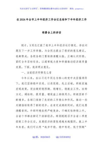/ 在2024年全市上半年经济工作会议总结和下半年经济工作部署会上的讲话