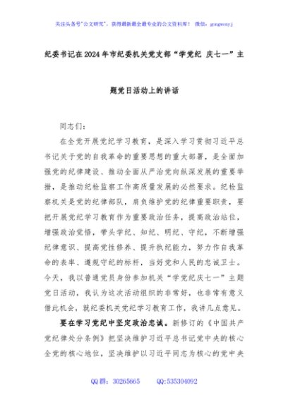 / 纪委书记在2024年市纪委机关党支部“学党纪 庆七一”主题党日活动上的讲话