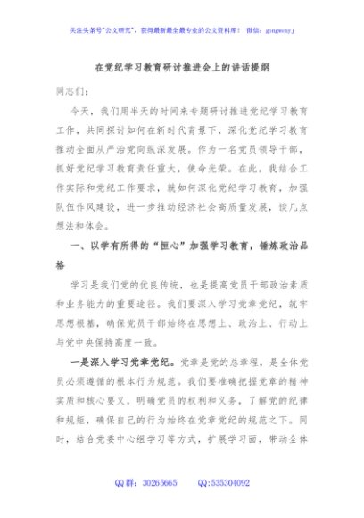 / 在党纪学习教育研讨推进会上的讲话提纲