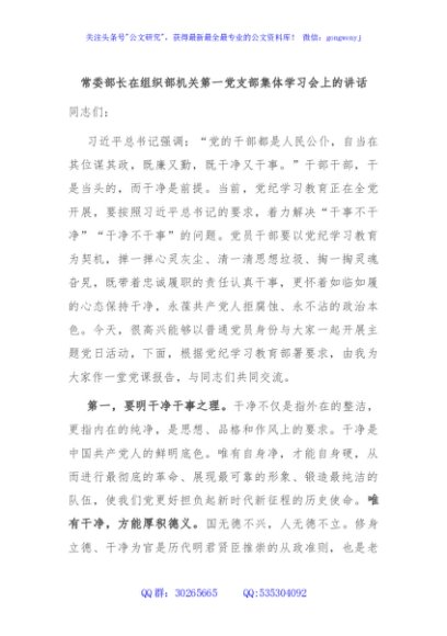 / 常委部长在组织部机关第一党支部集体学习会上的讲话