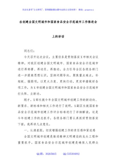 / 在创建全国文明城市和国家食品安全示范城市工作推进会上的讲话