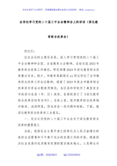 / 在传达学习党的二十届三中全会精神会上的讲话(深化教育综合改革会)