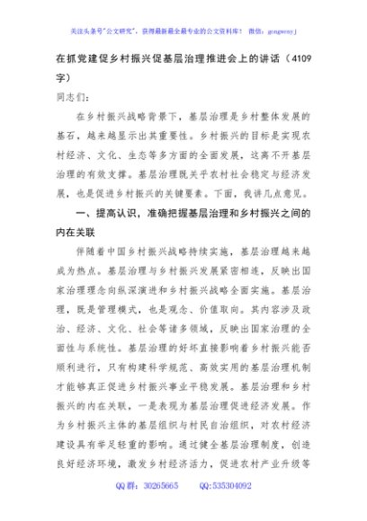 / 在抓党建促乡村振兴促基层治理推进会上的讲话(4109字)