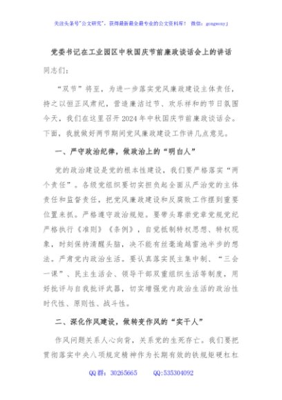 / 党委书记在工业园区中秋国庆节前廉政谈话会上的讲话