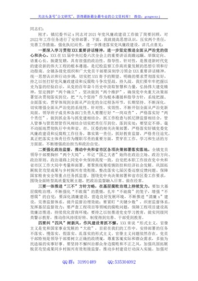 / 乡镇党委书记在2022年党风廉政建设工作会议上的讲话