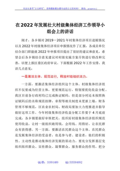 / 在2022年发展壮大村级集体经济工作领导小组会上的讲话