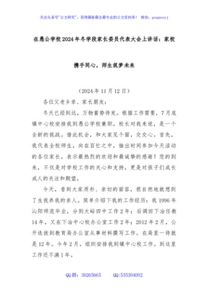 / 在愚公学校2024年冬学段家长委员代表大会上讲话:家校携手同心,师生筑梦未来