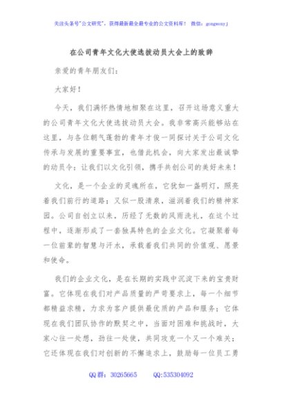 / 在公司青年文化大使选拔动员大会上的致辞