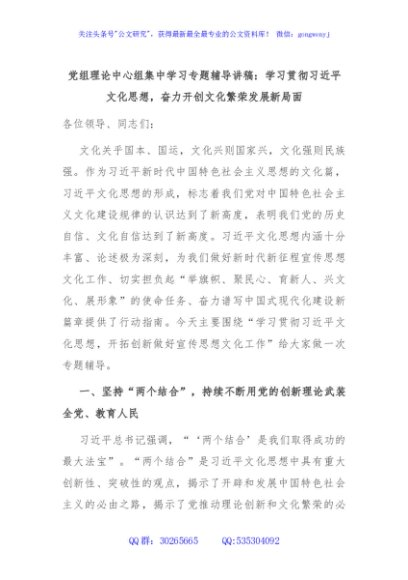 / 党组理论中心组集中学习专题辅导讲稿:学习贯彻习近平文化思想,奋力开创文化繁荣发展新局面