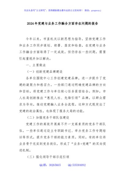 / 2024年党建与业务工作融合方面存在问题的报告
