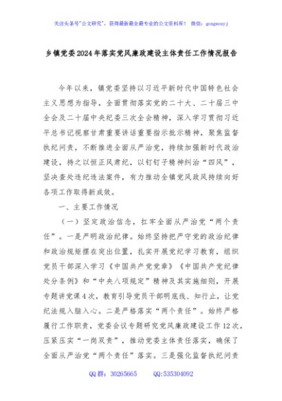 / 乡镇党委2024年落实党风廉政建设主体责任工作情况报告