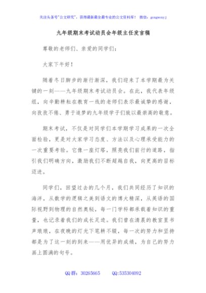 / 九年级期末考试动员会年级主任发言稿