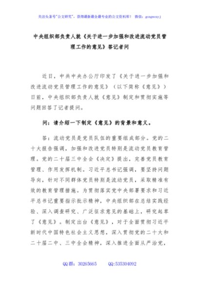 / 中央组织部负责人就《关于进一步加强和改进流动党员管理工作的意见》答记者问