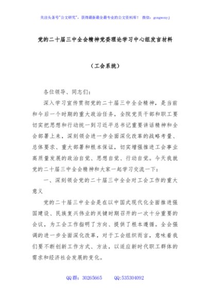 / 党的二十届三中全会精神党委理论学习中心组发言材料(工会系统)