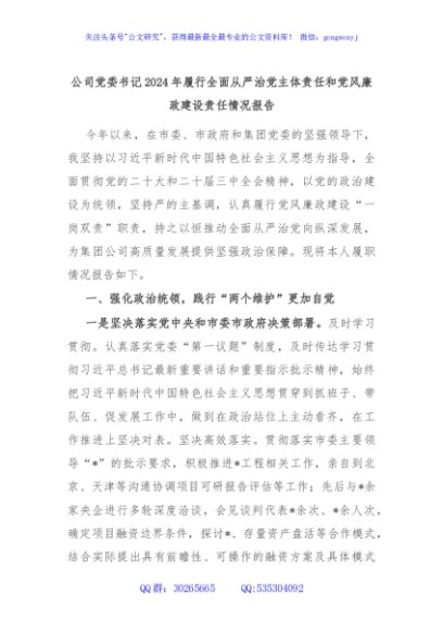 / 公司党委书记2024年履行全面从严治党主体责任和党风廉政建设责任情况报告