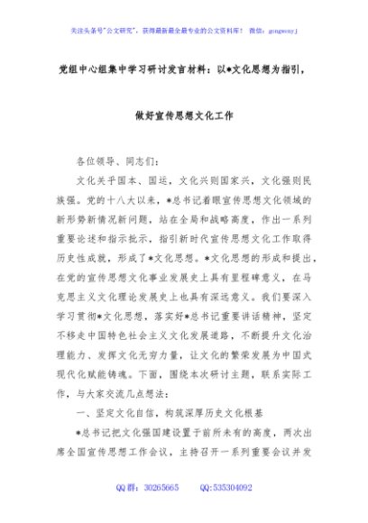 / 党组中心组集中学习研讨发言材料:以总书记文化思想为指引 做好宣传思想文化工作