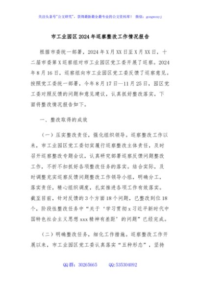 / 市工业园区2024年巡察整改工作情况报告