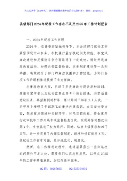 / 县级部门2024年纪检工作存在不足及2025年工作计划报告