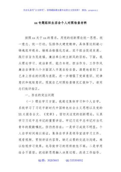 / xx专题组织生活会个人对照检查材料