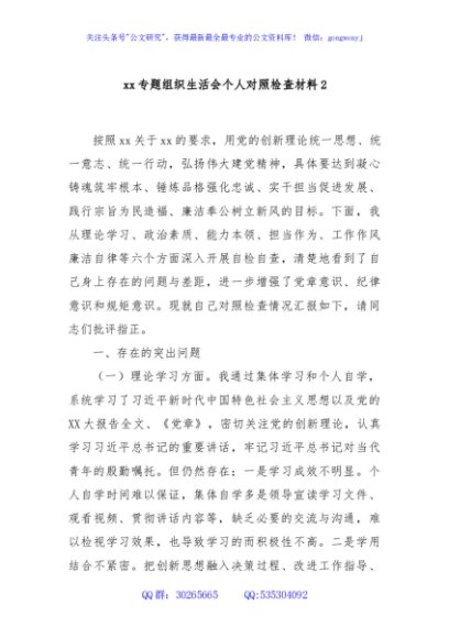 / xx专题组织生活会个人对照检查材料2