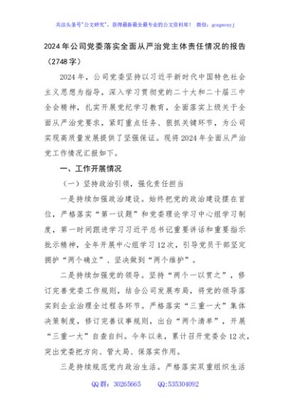 / 2024年国企党委落实全面从严治党主体责任情况的报告(2748字)