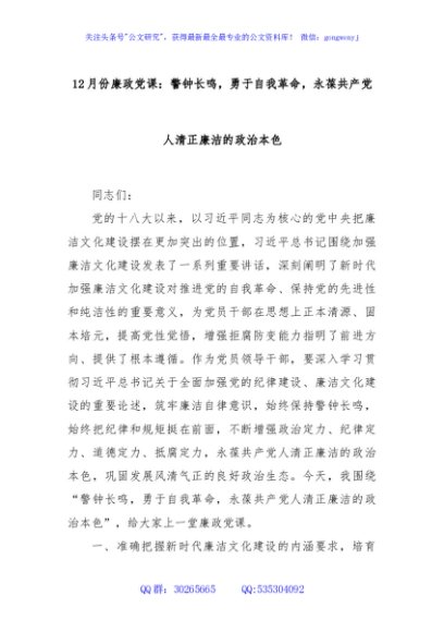 / 12月份廉政党课:警钟长鸣,勇于自我革命,永葆共产党人清正廉洁的政治本色