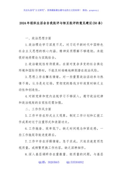 / (50条)2024年组织生活会自我批评与相互批评的意见建议