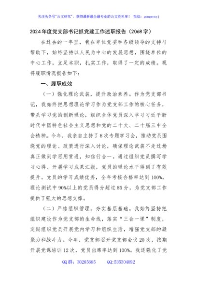 / 2024年度党支部书记抓党建工作述职报告(2068字)