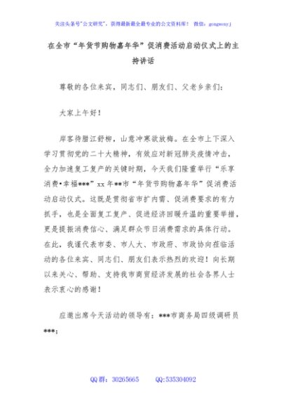 未生成预览图,长按二维码添加 在全市“年货节购物嘉年华”促消费活动启动仪式上的主持讲话 - 公文研究