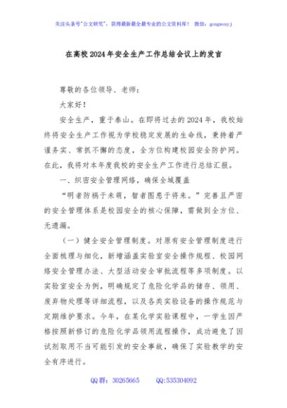 / 在高校2024年安全生产工作总结会议上的发言