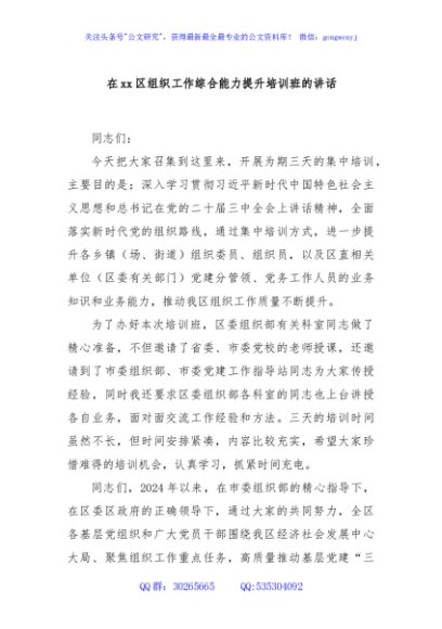 / 在xx区组织工作综合能力提升培训班的讲话