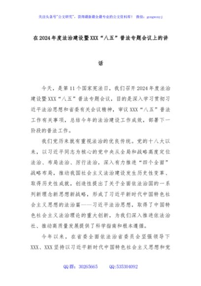 / 在2024年度法治建设暨XXX“八五”普法专题会议上的讲话