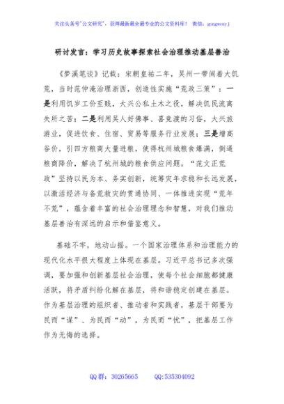 研讨发言:学习历史故事探索社会治理推动基层善治