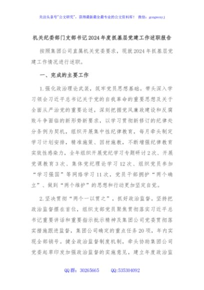 / 机关纪委部门支部书记2024年度抓基层党建工作述职报告