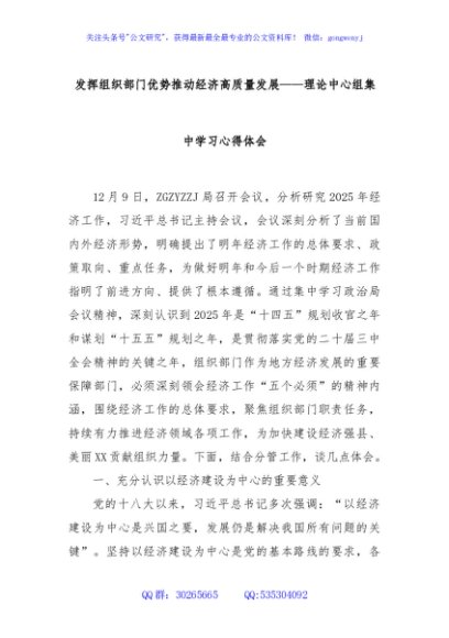 / 发挥组织部门优势推动经济高质量发展——理论中心组集中学习心得体会